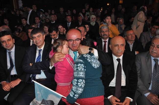 Belediye Başkan adayı Recep Barut, eşi ve kızlarıyla birlikte sahneye çıkarak Mustafa Ceceli’ye ‘hoş geldiniz’ dedi.