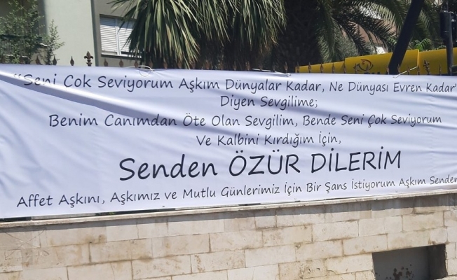 Aydın’ın Efeler ilçesi Cumhuriyet Mahallesi’nde bir aşık, sevgilisinden özür dilemek için ilginç bir yöntem seçti. Sevgilisinden özür dilediği ve üzerinde, “Seni çok seviyorum aşkım, dünyalar kadar. Ne dünyası evren kadar diyen sevgilime; benim canımdan öte olan sevgilim, ben de seni çok seviyorum. Kalbini kırdığım için senden özür dilerim. Affet aşkını, aşkımız ve mutlu günlerimiz için bir şans istiyorum aşkım senden” yazılı pankartı cadde üzerindeki bir sitenin duvarına astı.