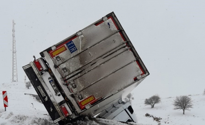 Bingöl’ün Karlıova ilçesinde kayan tır, şarampole indi, dorsesi ise devrilmeye ramak kala yan durdu.