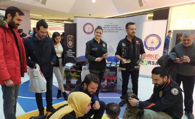 Bursa narkotik polisinin uyuşturucu madde ile mücadeleye yönelik vatandaşları bilgilendirmek için bir AVM’de düzenlediği nokta uygulaması Bursalılar tarafından yoğun ilgi gördü. Narkotik köpekleri Rona ve Galia’yı gören çocuklar, uyuşturucu avcısı köpeklerle bol bol fotoğraf çektirdi.