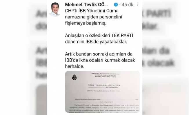 CHP’li İBB yönetiminin bu uygulamasını fişleme olarak değerlendiren ve İstanbul Büyükşehir Belediye (İBB) Meclisi AK Parti Grup Başkanvekili ve Esenler Belediye Başkanı M. Tevfik Göksu, “Bundan sonraki adımları da İBB’de ikna odaları kurmak olacak herhalde” diye tepki gösterdi. Göksu sosyal medya hesabından şunları paylaştı: “CHP’li İBB Yönetimi Cuma namazına giden personelini fişlemeye başlamış. Anlaşılan o özledikleri tek parti dönemini İBB’de yaşatacaklar. Artık bundan sonraki adımları da İBB’de ikna odaları kurmak olacak herhalde”.