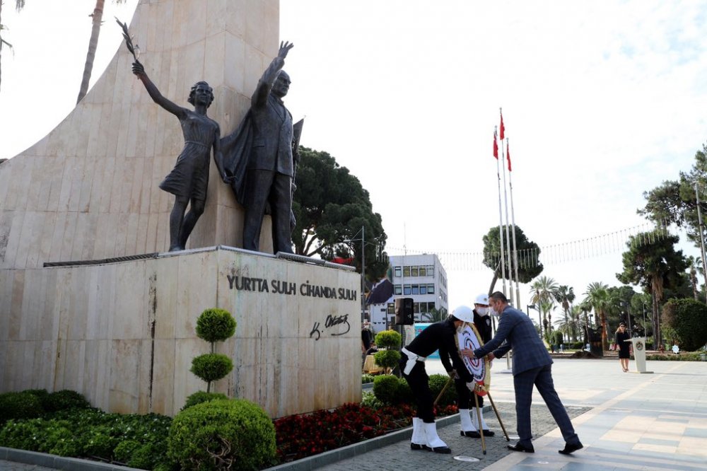 Alanya’da koronavirüs salgını nedeniyle çocukların ve vatandaşların katılmadığı 23 Nisan Ulusal Egemenlik ve Çocuk Bayramı töreninde, protokol üyeleri tarafından Atatürk Anıtı önüne çelenk bırakıldı.