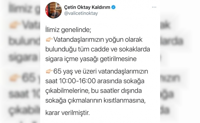 SAKARYA VALİSİ ÇETİN OKTAY KALDIRIM, SOSYAL MEDYA HESABINDAN YAPTIĞI PAYLAŞIMDA VATANDAŞLARIN YOĞUN OLARAK BULUNDUĞU TÜM CADDE VE SOKAKLARDA SİGARA İÇME YASAĞININ GETİRİLDİĞİ VE 65 YAŞ ÜZERİ VATANDAŞLARIN 10.00-16.00 ARASINDA SOKAĞA ÇIKABİLMELERİNE, BU SAATLER DIŞINDA SOKAĞA ÇIKMALARININ KISITLANMALARINA KARAR VERİLDİĞİNİ DUYURDU.