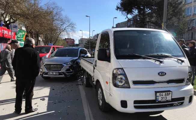 Sakarya’nın Adapazarı ilçesinde yaya geçidinde yayaya yol vermek için yavaşlayarak duran kamyonete arkasından gelen cip çarptı.