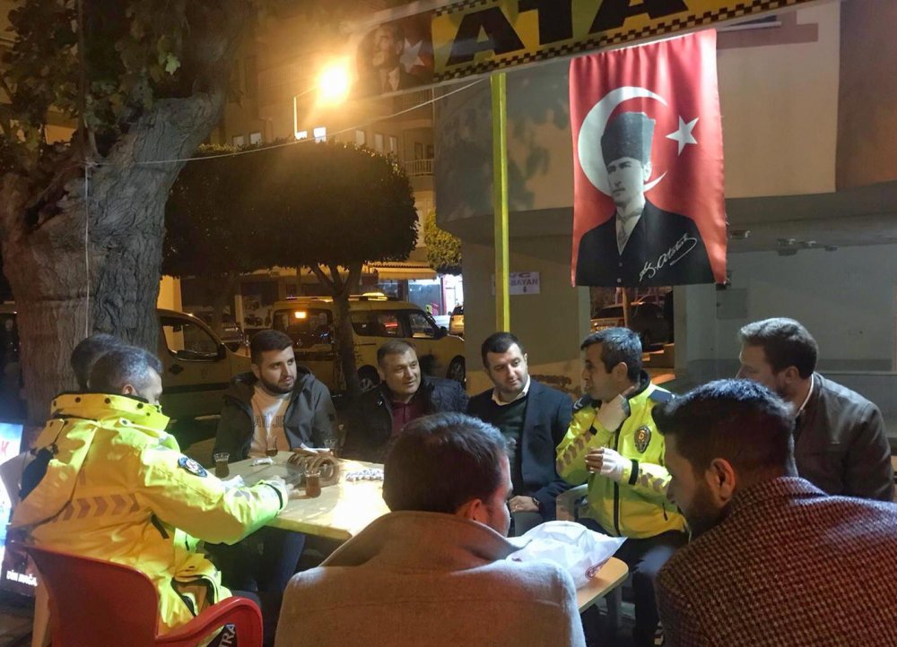 Adalet ve Kalkınma Partisi (AK Parti) Alanya İlçe Teşkilatı Gençlik Kolları Başkanı Cemal Yeniacun ve yönetimi 2019’un son gününde de anlamlı bir ziyaret yaptılar. Yeni yıl kutlamaları sırasında görevi başında olan emniyet güçleri ve taksicileri ziyaret eden Yeniacun ve yönetimi İskele’de bulunan karakolu ziyaret ederek, polislerle buluştular. Daha sonra Ata Taksi Durağı’na giden gençlerle taksicilerle de bir araya geldiler. Gençleri görünce oldukça mutlu olan polisler ve taksiciler, AK Partili gençlerle çay içerek sohbet ettiler. Ziyaretler hakkında konuşan Gençlik Kolları Başkanı Cema l Yeniacun, “Yeni yıla saatler kala milletin huzuru ve güvenliği için görevi başında olan emniyet güçlerini ve mesaide olan taksici esnafını ziyaret ettik. Birlikte çay içip sohbet ettik. Vatandaşlarımız eğlenirken, onların güvenliği ve ulaşımını sağlayan emniyet güçlerimize ve taksicilerimize teşekkür ediyoruz” dedi.